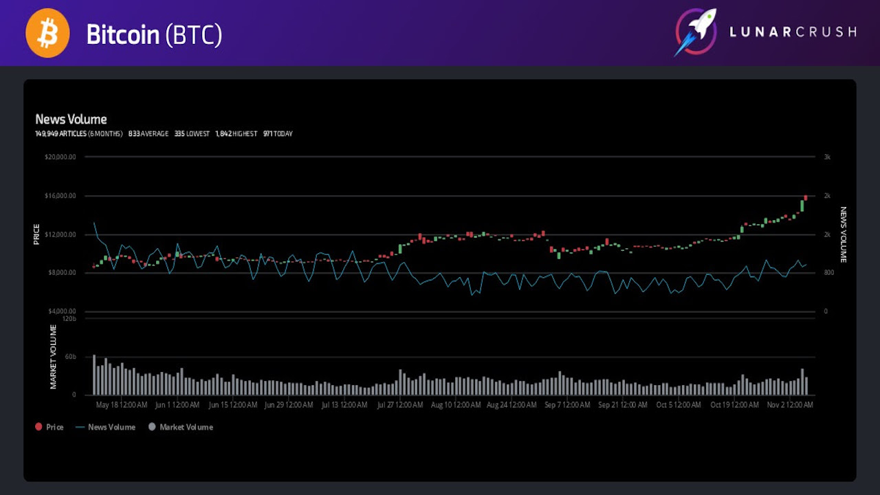 The price of Bitcoin has risen over the past few months, recently surpassing $16,000. However, according to LunarCRUSH, with the focus on the US Presidential Election and spikes in COVID-19, article and searches have not kept pace with the price. This bodes well for the price of Bitcoin as it gains more attention over the next 12-18 months.