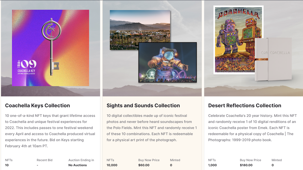 Coachella, one of the most popular music festivals in the world, announced that it will offer a collection of NFTs. In partnership with cryptocurrency exchange FTX, there will be three tiers of NFTs offered with the most limited being a set of ten that grant lifetime access to the festival and other perks during the festival weekends this year. The other two sets, in quantities of 1,000 and 10,000, will be redeemable for physical art or a commemorative photo book.