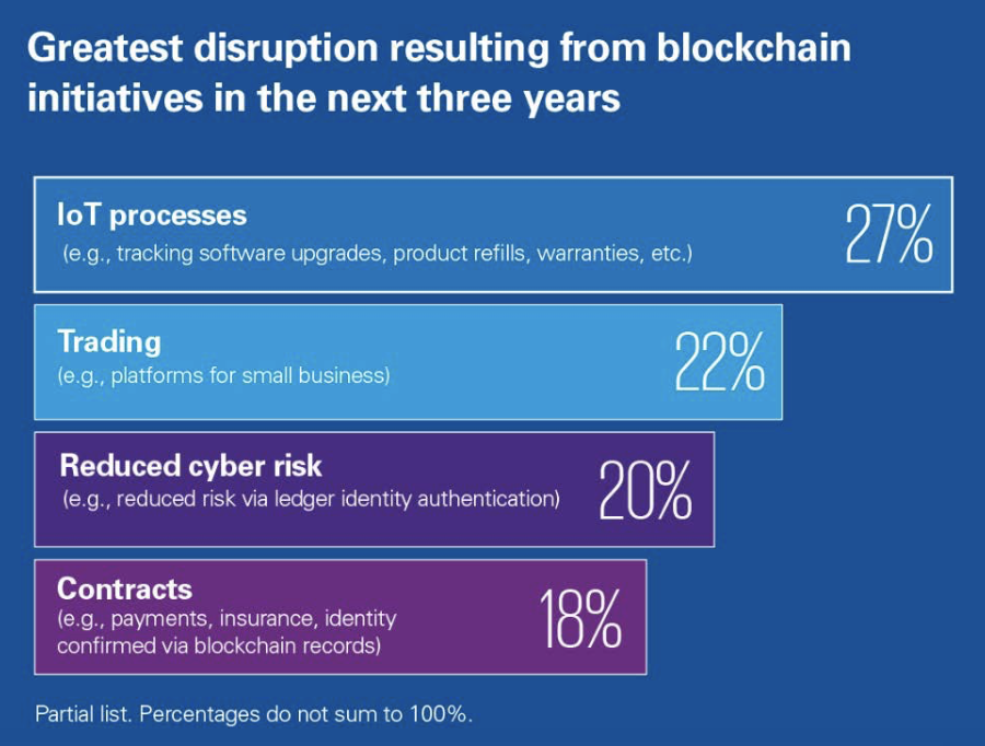 The four most disruptive areas include Internet of Things (IoT) processes, Trading, Cyber Risk, and Contracts