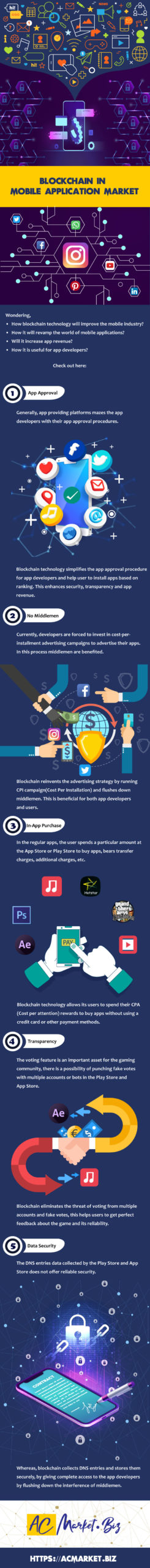 This infographic outlines the latest for Blockchain in Mobile App Development, including: App Approval, Disintermediation, In-App Purchases, Transparency, and Data Security.