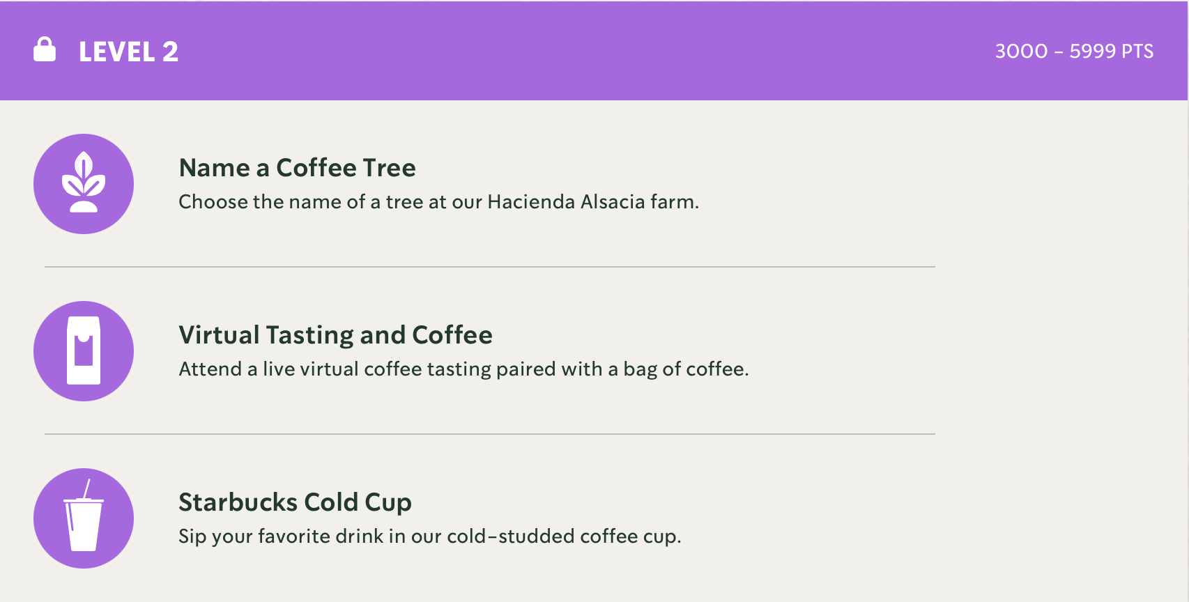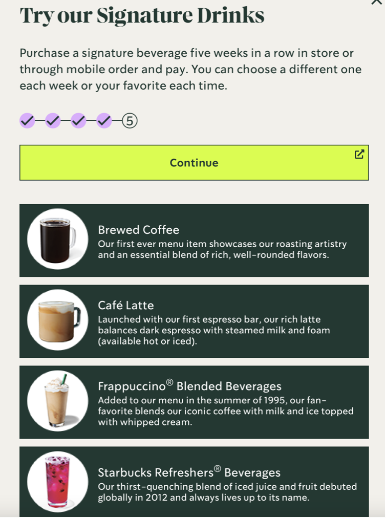 In traditional loyalty programs, the only way to earn points is to make purchases and Odyssey does not lose that aspect. However, instead of creating a system that only equates points with dollars, Odyssey allows Starbucks to create a flexible system that offers free items, as well as opportunities to give back (donate meals to charity) or earn intangible rewards (name a tree at a Starbucks farm). These benefits can be offered for a limited time and changed with the changing needs of the business over time. The initial Odyssey rewards are: