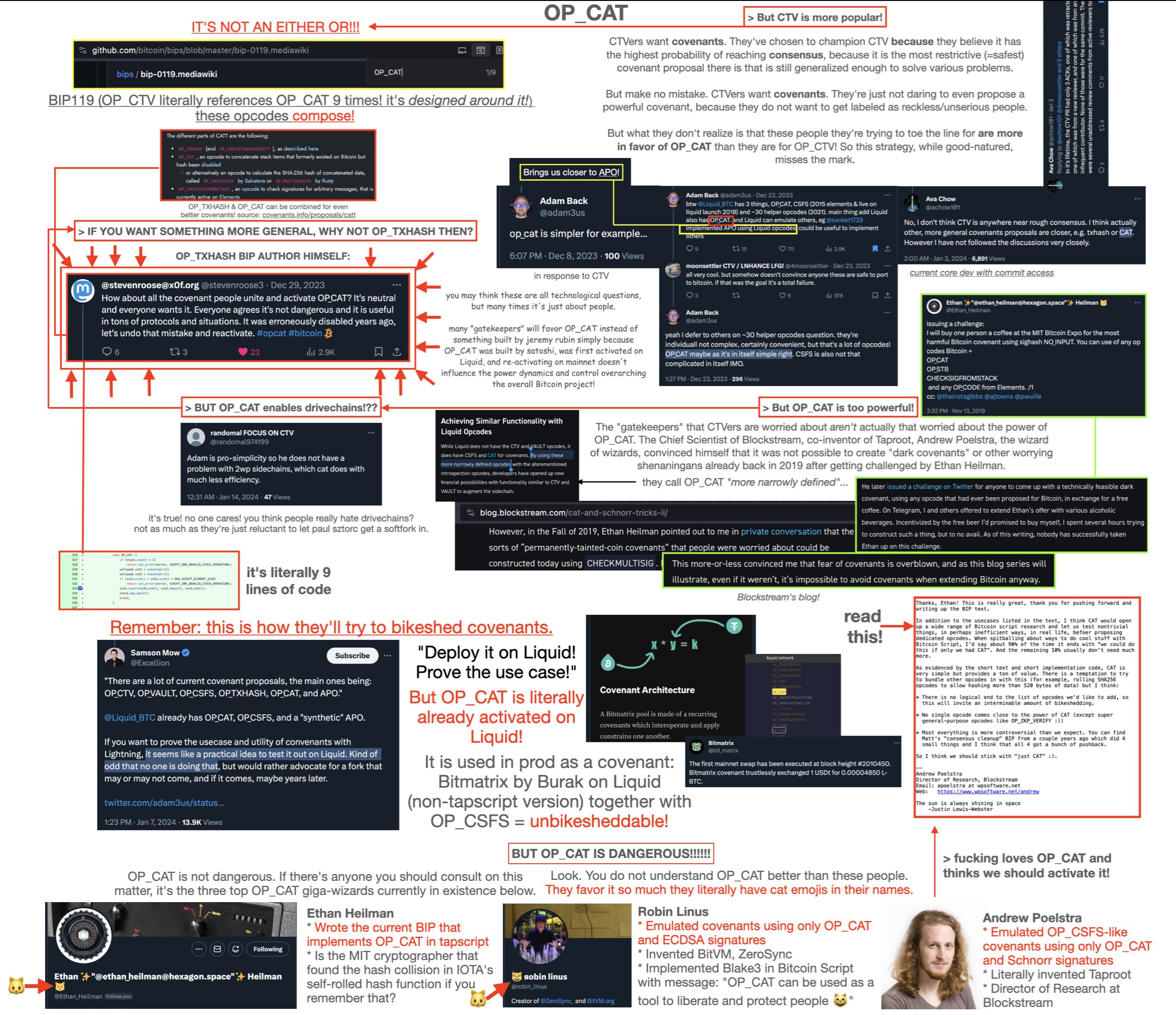 There is debate in the Bitcoin community of whether OP_CAT or OP_CTV should be used and Wall makes it very clear in this graphic what is going on: