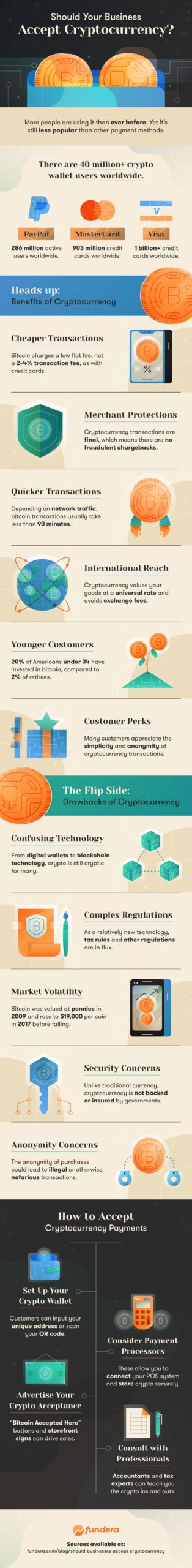 Opinion Should Your Business Accept Cryptocurrency [Infographic] ByMeredith Wood Published on December 15, 2019 Share Tweet Continue Reading Related Topics:Bitcoin, featured, payments Meredith Wood Meredith Wood is the founding editor of the Fundera Ledger and a vice president at Fundera. She launched the Fundera Ledger in 2014 and has specialized in financial advice for small business owners for almost a decade.